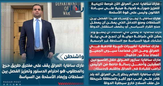 أعلن الأميركي دونالد ترامب تعيين مارك سافايا، بائع حشيشة رسمي المقيم في ميشيغان مبعوثاً خاصاً إلى العراق.وكتب ترامب، أمس الأحد، على حسابه في "تروث سوشيال": "يسرني أن أعلن أن مارك سافايا سيشغل منصب المبعوث الخاص إلى العراق"