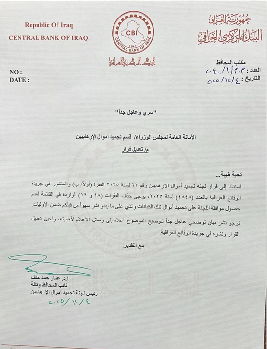 في البنوك العراقية ! والقرار صدر في جريدة الوقائع العراقية تحت عنوان